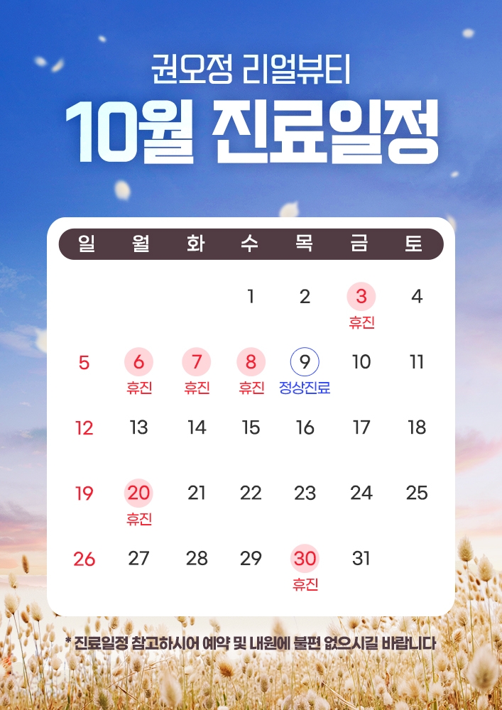 실시간 빠른상담 이름 연락처 010 011 017 018 019 개인정보취급방침 상담신청 [권오정리얼뷰티의원] 10월 진료일정 작성자 : 리얼뷰티 작성일 : 2025-09-30 조회수 : 553 목록